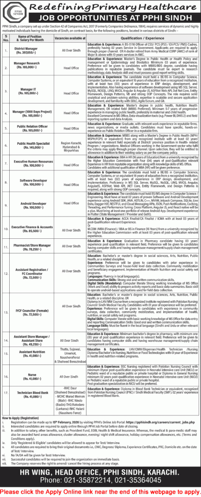 PPHI Sindh has announced multiple job opportunities for qualified and experienced candidates across Sindh. These positions are offered on a contract basis and are available in Head Office, Karachi, and various districts of Sindh. Both male and female candidates having Sindh domicile are eligible to apply.